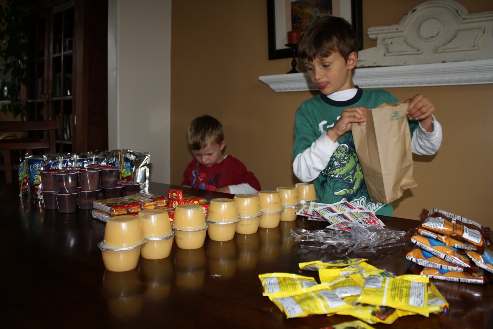 Our service project for the week was to pack paper bag lunches for homeless folks to keep in our car. We see a lot of homeless people on the corners in town during the week. Truman always wants to give them money or take them home, and we have, but too many times I was short on cash because I gave it away, so this is my solution. The boys loved shopping for non-perishable food and assembling the lunch bags, Truman being very considerate to remember Wet Wipes so they can have clean hands to eat. In the end, their desire to eat the chocolate pudding cups overwhelmed their desire to help more unfortunate people, and they tried to convince me that homeless people really don't like chocolate.